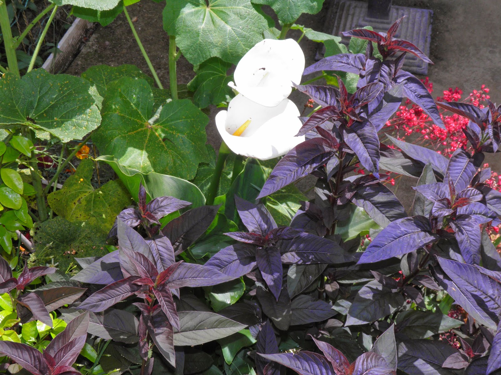 La lysimaque, roses trémières et Arums